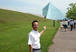 モエレ沼公園は国際芸術祭開会式のメイン会場になります。この公園は1979年札幌市のゴミ処理場としとて利用開始され,1982年に札幌市の市街地を公園や緑地の帯で包み込もうという「環状夢のグリーベルト構想」として公園整備に着手し2005年にグランドオープンした総合公園であります。世界的に有名な彫刻家イサム・ノグチが手掛け全体をひとつの彫刻作品とするコンセプトのもとに造成され,広大な敷地に幾何学形態を多用した山や噴水,道具などの施設が整然と配置されており自然とアートが融合した景観を楽しむことができます。中でもガラスのピラミッドは公園のシンボルとして交流の拠点になっております。今回の国際芸術祭ではこうした自然とアートの融合という視点からメイン会場として選定されたと伺いました。平成18年より指定管理者制度により公園緑化協会により運営されておりますが,年間1億円を超える予算が拠出されております。特出する取り組みとしては,雪冷房システムを採用している点でありますが,これは雪が溶ける時にまわりから熱を奪いますがこの性質を利用し冷凍機の変わりに水を冷やして利用する雪冷房です。冬場の雪を貯蔵し夏に冷房として活用する発想はまさに雪国ならではの取り組みであると思います。